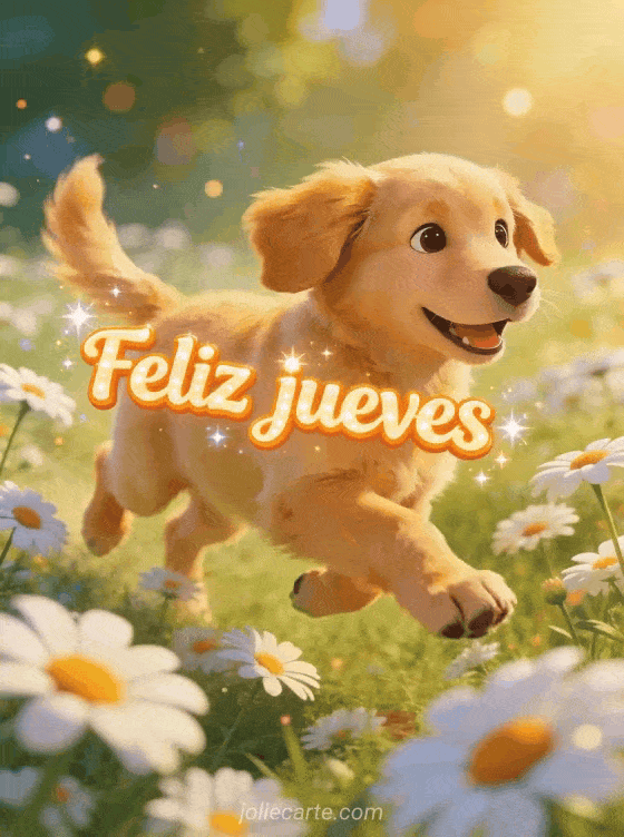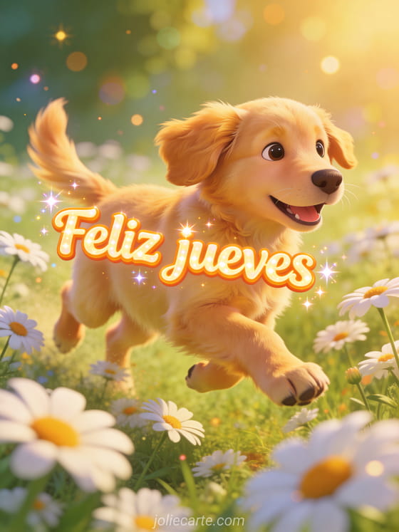 Envía un saludo alegre de feliz jueves con un cachorro golden retriever juguetón saltando por un campo de margaritas en un ambiente soleado. Descubre también feliz jueves lluvioso gif, buenos días feliz jueves deporte imagen o tarjetas para desear un feliz jueves.