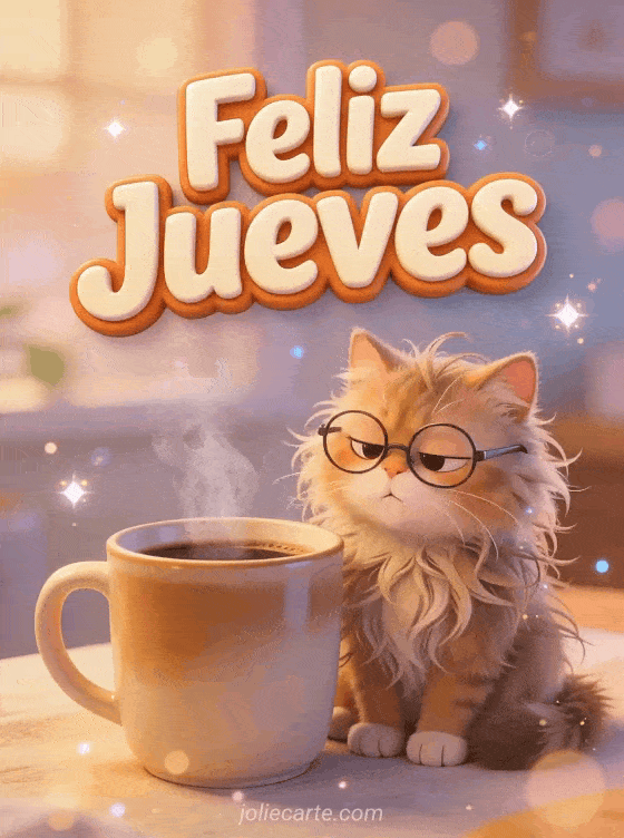 Saca una sonrisa el jueves con esta divertida tarjeta Feliz Jueves con un gato gruñón pero tierno con pequeños lentes de lectura junto a una taza gigante de café. Descubre también una tarjeta Buenos Días Jueves o una tarjeta Feliz Jueves Soleado.