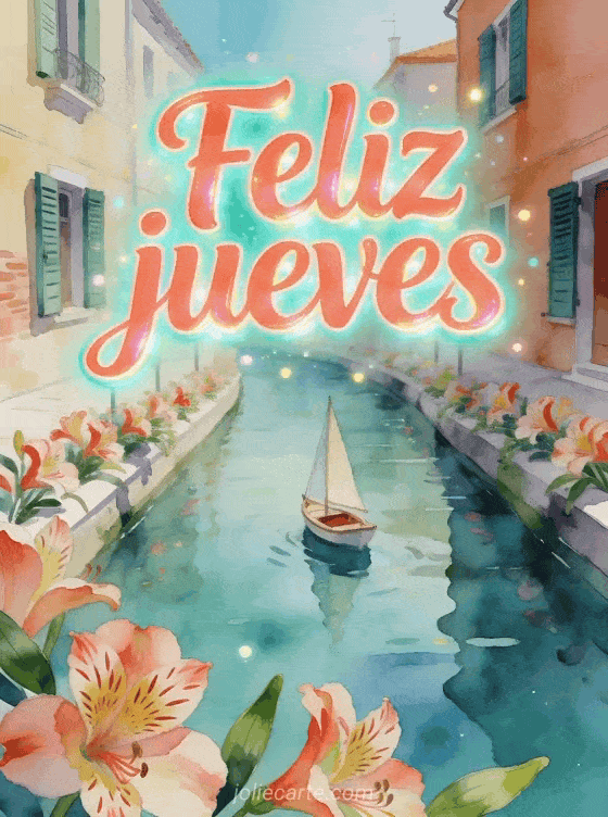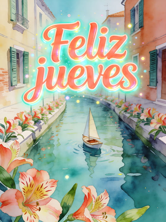Envía un deseo alegre de jueves con letras coral, una escena de canal, un pequeño velero, postigos pintados y pétalos de alstroemeria cruzando el borde. Descubre también buenos días feliz jueves besos imágenes, una buenos días feliz jueves cita o un texto para desear un feliz jueves.