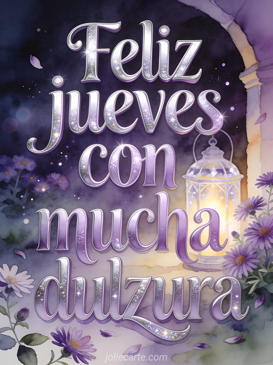 Envía un deseo delicado de jueves con texto lavanda plateado, una linterna de cristal luminosa, asters morados y luz brillante en un rincón encantado de jardín. Descubre también un buenos días feliz jueves gif animado, feliz jueves gifs o una buenos días y feliz jueves imagen.