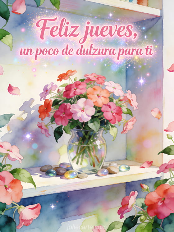 Comparte una tarjeta dulce de feliz jueves con un jarrón de vidrio lleno de flores de impatiens, piedras decorativas y un estante pintado luminoso. También puedes enviar imágenes de buenos días de jueves, feliz jueves besos imágenes o un buenos días feliz jueves paisaje.