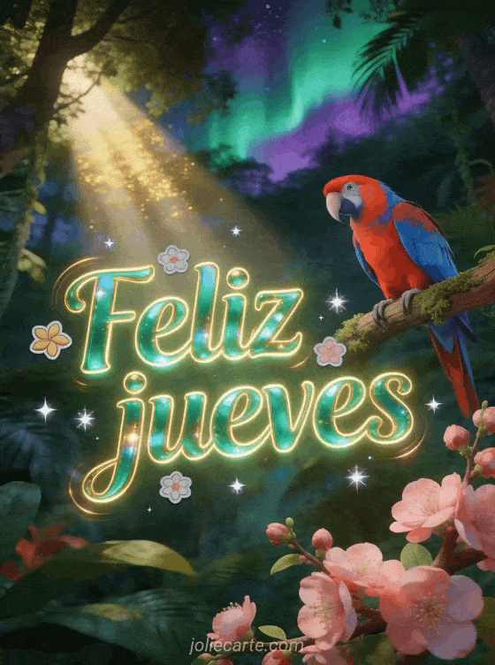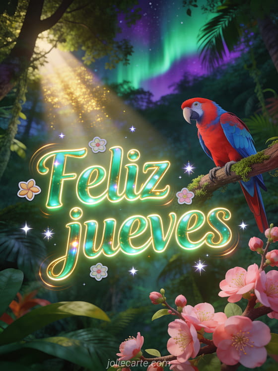 Envíen una tarjeta de feliz jueves con letras esmeralda, flores de almendro, estrellas brillantes y un guacamayo rojo y azul en un bosque tropical bajo una aurora verde y violeta. Descubran también un pensamiento positivo positivo feliz jueves cita, un buen día de jueves imágenes o un feliz jueves imágenes con rosas.