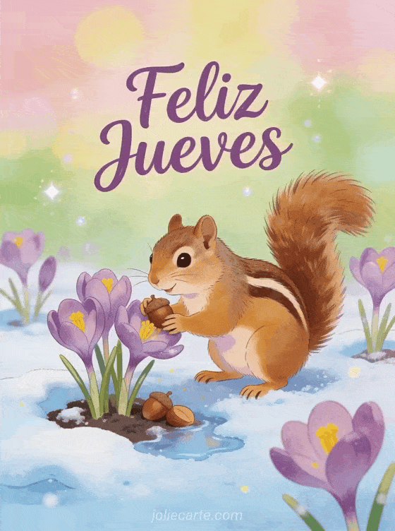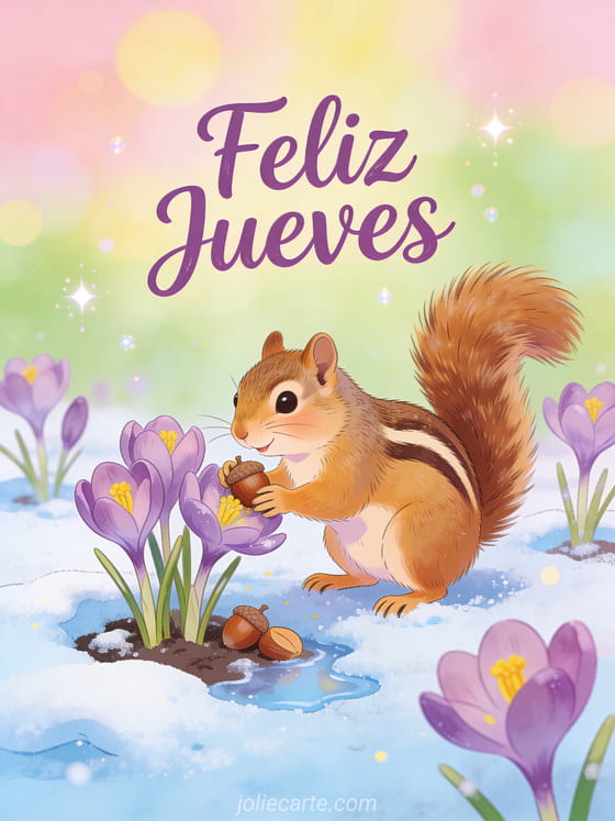 Ilumina el jueves de alguien con esta adorable tarjeta con una alegre ardilla recogiendo bellotas entre azafranes violetas emergiendo de la nieve. Descubre también una tarjeta buenos días jueves, una tarjeta jueves humor buen día o una tarjeta buenos días y feliz jueves.