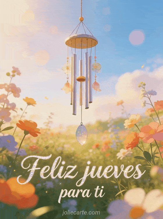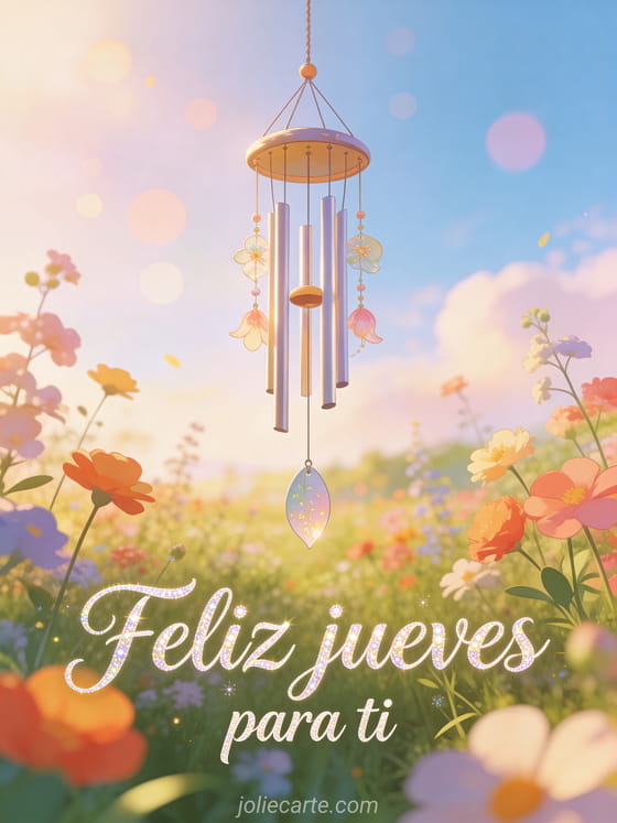 Comparte feliz jueves para ti con cursiva fluida, brillo sutil, una pradera primaveral colorida, un carillón colgante, luz de la mañana y bokeh suave. Descubre también jueves buen día, bella imagen para decir feliz jueves o feliz jueves cita imágenes.