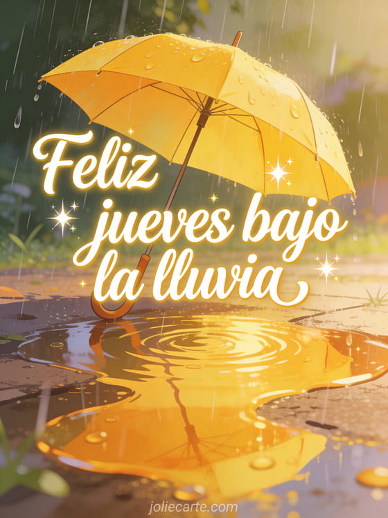 Comparte feliz jueves bajo la lluvia con cursiva suave, brillo delicado, un paraguas amarillo bajo lluvia viva, reflejos brillantes en los charcos y luz cálida acogedora. Descubre también buenos días feliz jueves deporte imagen, tarjetas para desear un feliz jueves o buenos días feliz jueves.