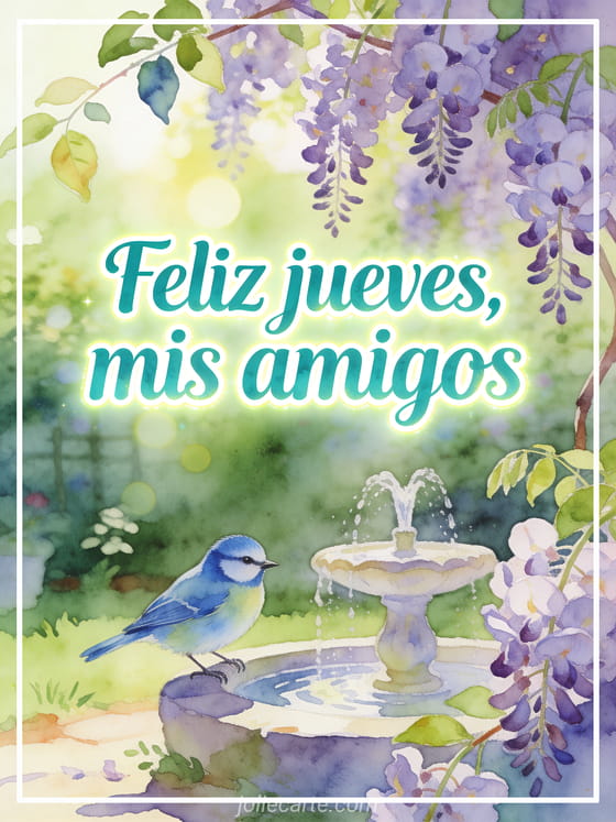 Envía un saludo amigable de feliz jueves a tus amigos con letras verde azulado en acuarela, un herrerillo cerca de una pequeña fuente, glicina florecida, luz verde fresca y un jardín soleado. También pueden compartir feliz jueves amigos poema, feliz jueves imagen gif o feliz jueves imagen brillante.