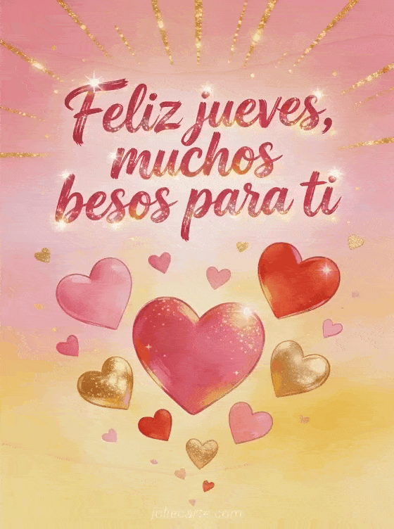 Comparte muchos besos de jueves con letras de pincel vivas, brillo resplandeciente, corazones grandes flotando entre luz dorada, degradados vibrantes y un ambiente cariñoso. Descubre también besos del jueves gifs, feliz jueves antes de navidad o feliz jueves bajo la lluvia gif.