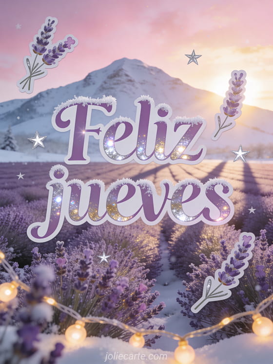 Envía feliz jueves mujer imágenes con letras elegantes violeta lavanda, reflejos plateados helados y un campo infinito de lavanda frente a una montaña nevada. Comparte un deseo poético entre semana y descubre también buenos días jueves imágenes, imagen para desear un feliz jueves o imágenes de besos del jueves.