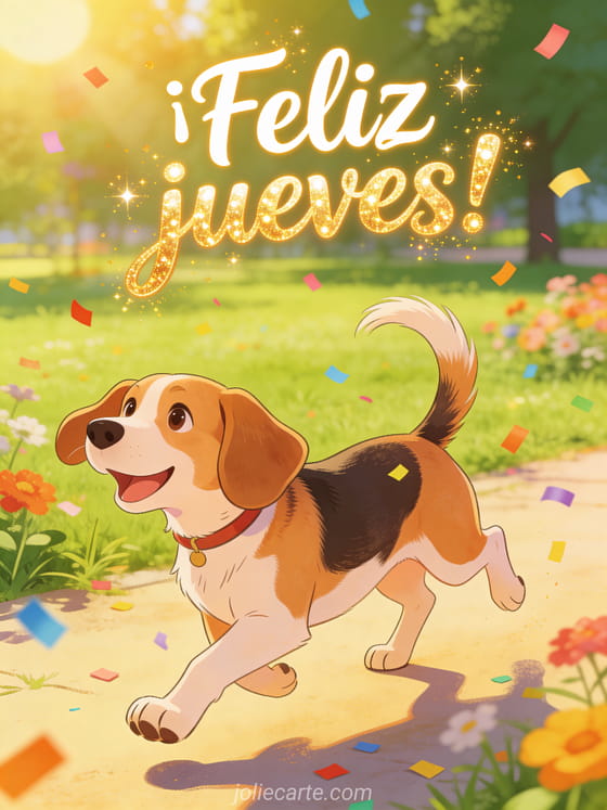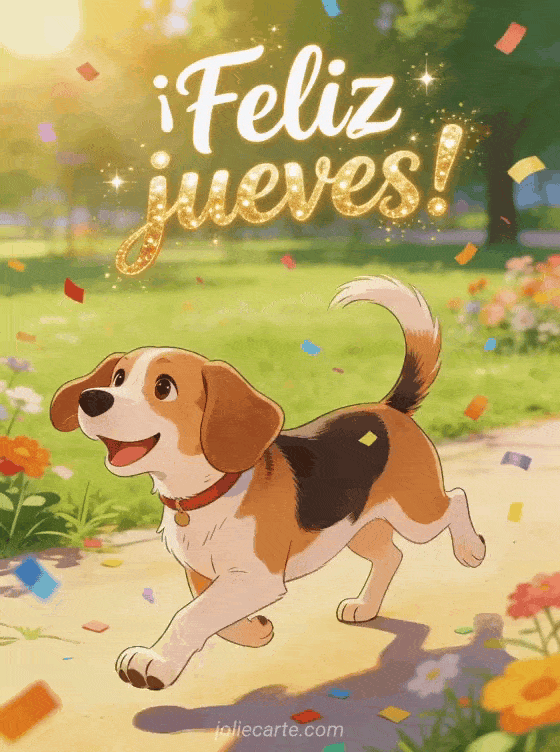 Envía un saludo alegre de feliz jueves con letras dinámicas, chispas doradas, un perro beagle juguetón en un parque soleado y acentos de confeti colorido para un ambiente de tarjeta luminosa. También pueden ver este feliz jueves gato gif, esta feliz jueves tarjeta virtual o estas feliz jueves mujer imágenes.