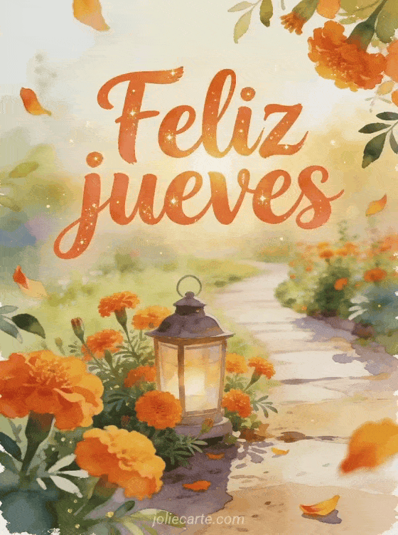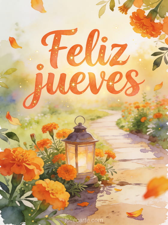 Envía un saludo alegre de feliz jueves con letras coral cálidas, destellos dorados, un sendero fresco de jardín por la mañana, caléndulas, una pequeña linterna y luz dorada suave. También pueden compartir buenos días jueves cita, feliz jueves imagen animada o buenos días feliz jueves besos imágenes.