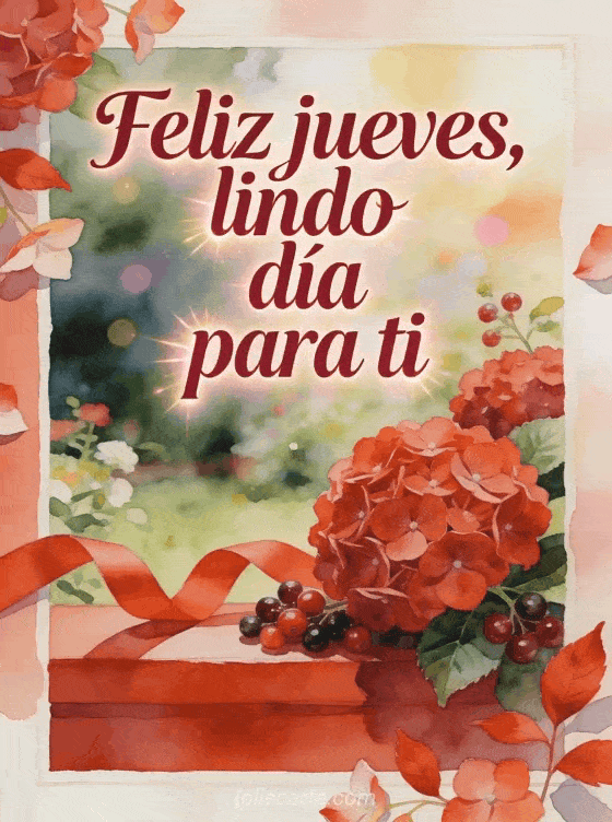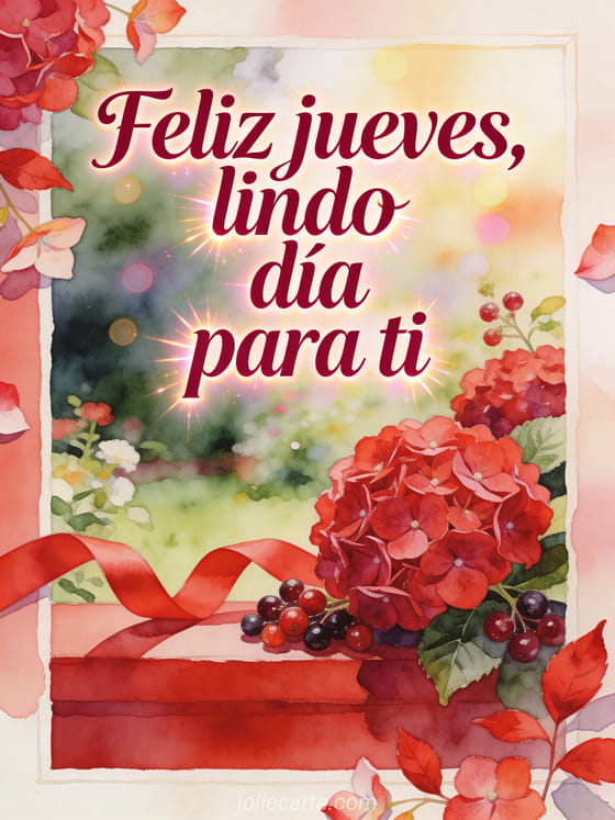 Comparte un mensaje cálido de feliz jueves con letras rubí, hortensias rojas, cintas y bayas brillantes en un jardín de acuarela. También pueden enviar un feliz jueves besos gif animado, unas feliz jueves a todos imágenes o un buenos días jueves gif.