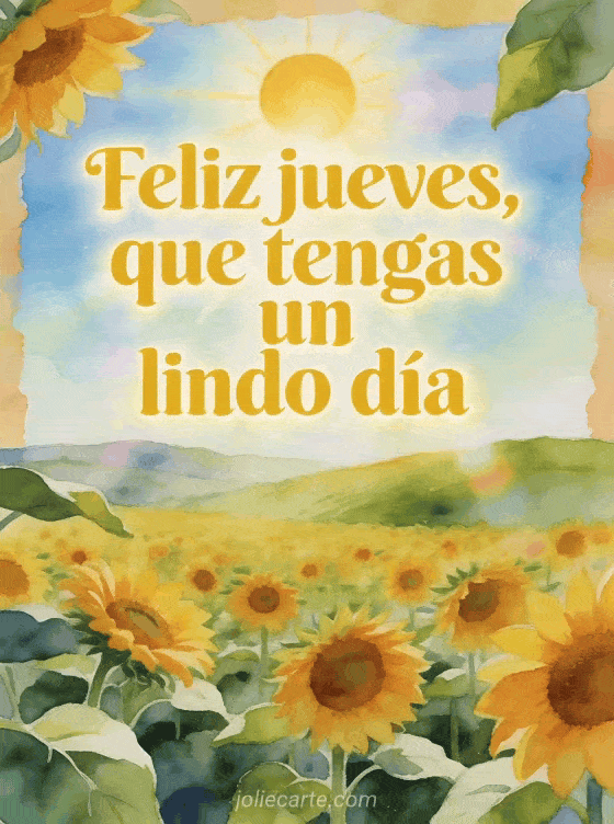 Envía un mensaje luminoso de jueves con un sol brillante sobre girasoles y colinas verdes en acuarela. Descubre también un feliz jueves rojo gif, un feliz jueves besos gif animado o feliz jueves a todos imágenes.