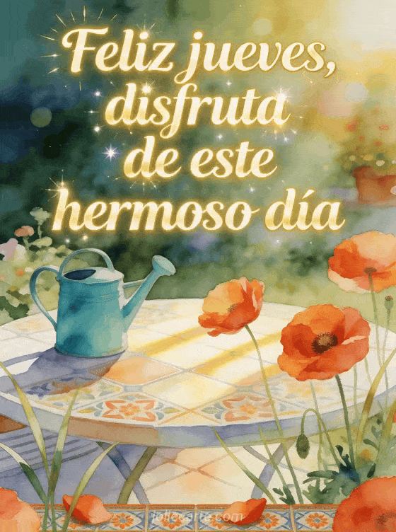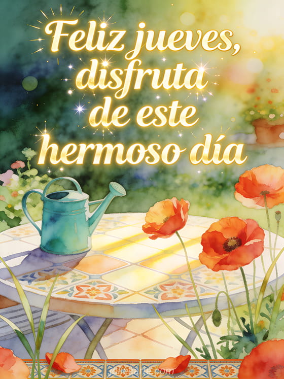 Desea un hermoso jueves con una mesa de jardín luminosa, una regadera turquesa, amapolas intensas y rayos de sol sobre baldosas estampadas. Descubre también imágenes para feliz jueves, un feliz jueves poema o una feliz jueves bendición.