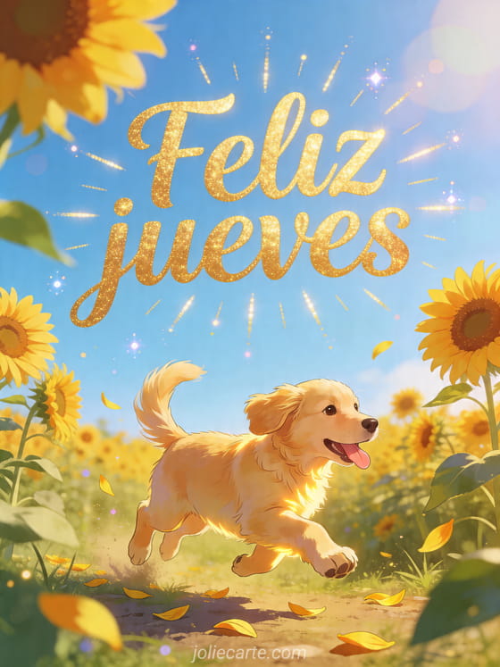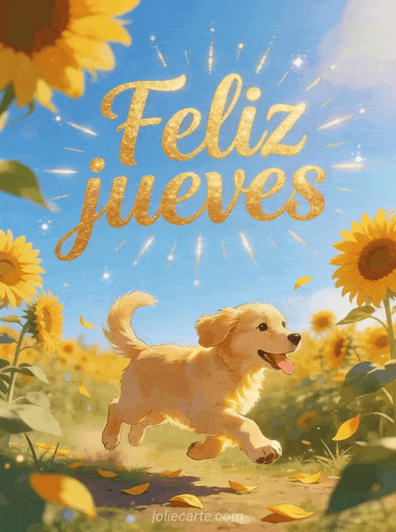 Llena el día de alegría con esta tarjeta de jueves que muestra a un cachorro golden retriever corriendo entre girasoles bajo un cielo azul de verano. También pueden descubrir linda noche de jueves, feliz jueves imagen gratis o gif feliz jueves humor.