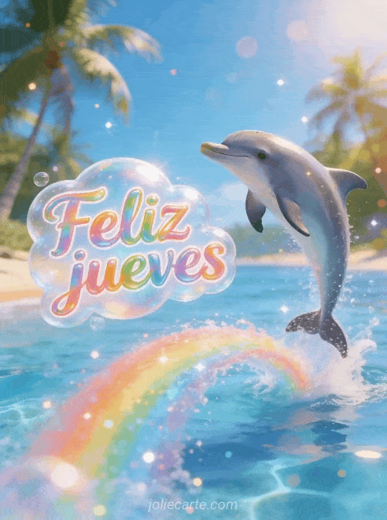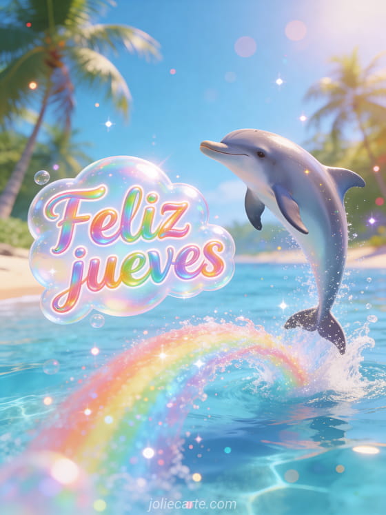Envíen un saludo luminoso de feliz jueves con letras burbuja de brillo arcoíris y un delfín alegre saltando del agua azul cristalina junto a una playa tropical. Descubran también tarjeta animada feliz jueves, buen jueves besos o buenos días feliz jueves tarjeta.