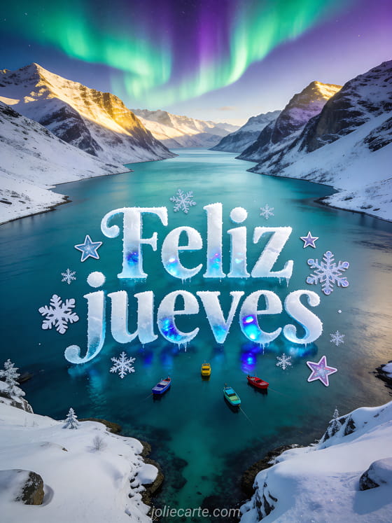 Compartan una tarjeta panorámica de feliz jueves con letras blancas heladas, reflejos azul ártico, copos de nieve, estrellas escarchadas, un fiordo turquesa entre montañas nevadas, barcos coloridos en aguas tranquilas y aurora boreal verde y violeta en el cielo. Vean también feliz jueves mujer imágenes, buenos días jueves imágenes o esta imagen para desear un feliz jueves.