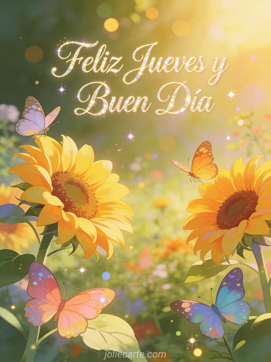 Ilumina el jueves de alguien con esta colorida tarjeta con mariposas danzando alrededor de girasoles en la luz dorada de la mañana. Descubre también una tarjeta feliz jueves lluvioso, una tarjeta feliz jueves minion gif o una tarjeta feliz jueves imágenes gratis.