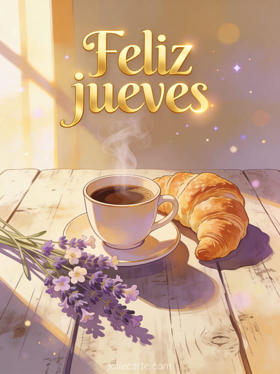 Comparte una hermosa tarjeta de feliz jueves con un café humeante, croissants frescos y flores de lavanda bajo cálida luz matutina. Descubre también una tarjeta un feliz jueves o una tarjeta buen jueves corazón.