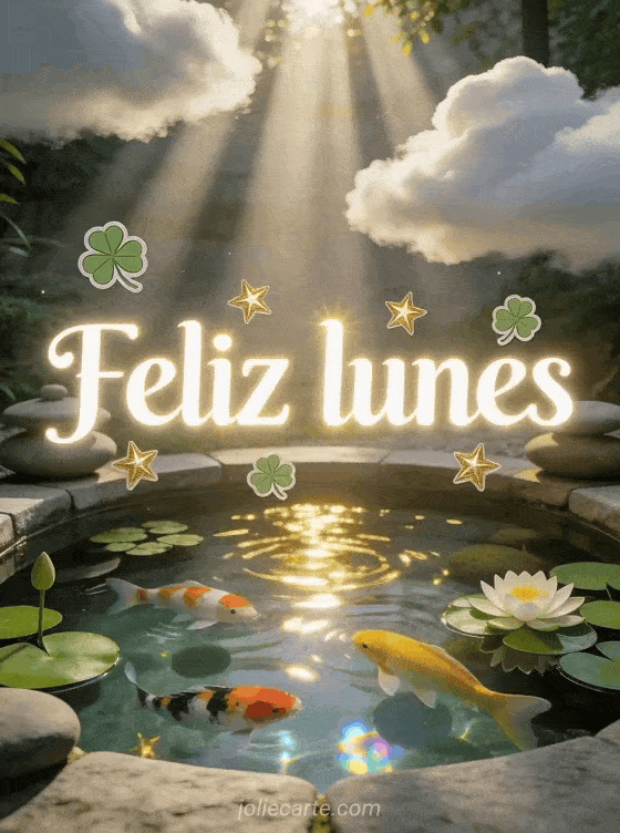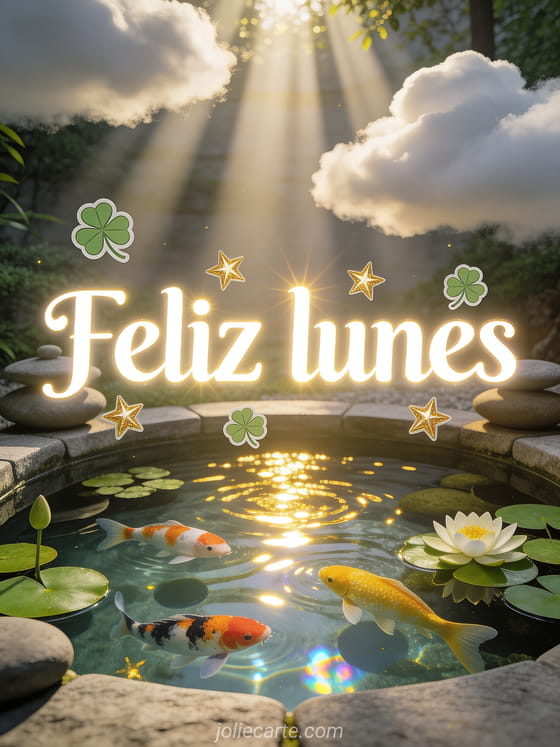 Compartan una tarjeta de feliz lunes llena de letras blancas luminosas, tréboles de la suerte, estrellas doradas y un estanque zen con nenúfares. Para más inspiración de lunes, vean esta tarjeta de imágenes gratis feliz lunes y buena semana, estas imágenes de buen café del lunes o un saludo de ánimo divertido feliz lunes.
