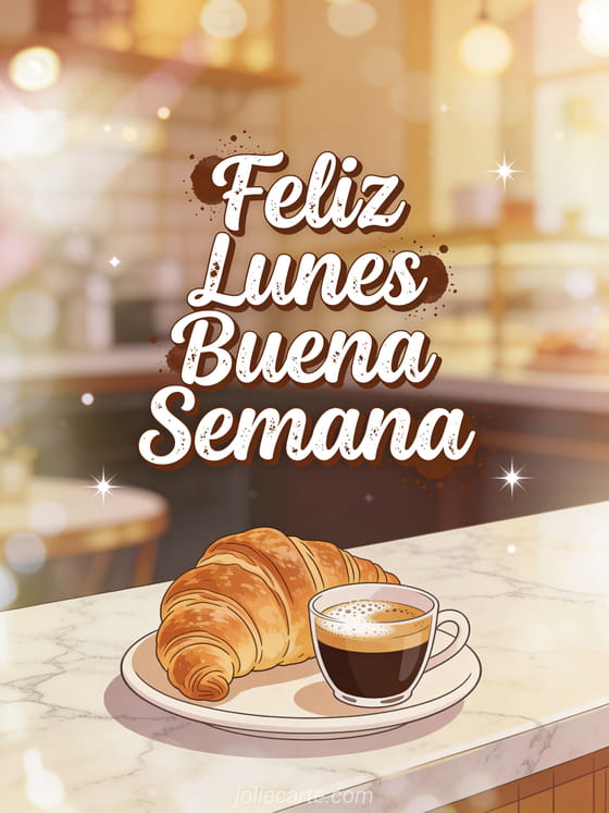 Empieza la semana de alguien con un desayuno parisino con croissant artesanal y espresso. Descubre también una tarjeta humor ánimo feliz lunes, una tarjeta feliz lunes muchos besos o una tarjeta positivo feliz lunes buena semana.