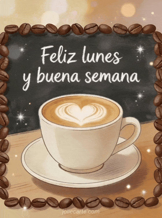 Envía una tarjeta de Feliz lunes con arte latte en una taza de cerámica para empezar la semana con calidez. Descubre también buena semana feliz lunes, feliz lunes y buena semana gif y feliz lunes cita.