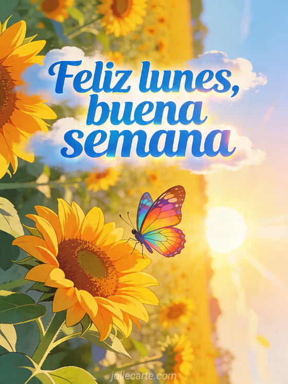 Comparte un divertido saludo de feliz lunes y buena semana con esta luminosa tarjeta de amanecer. Descubre también buenos días feliz lunes, feliz lunes imagen o feliz lunes divertido.