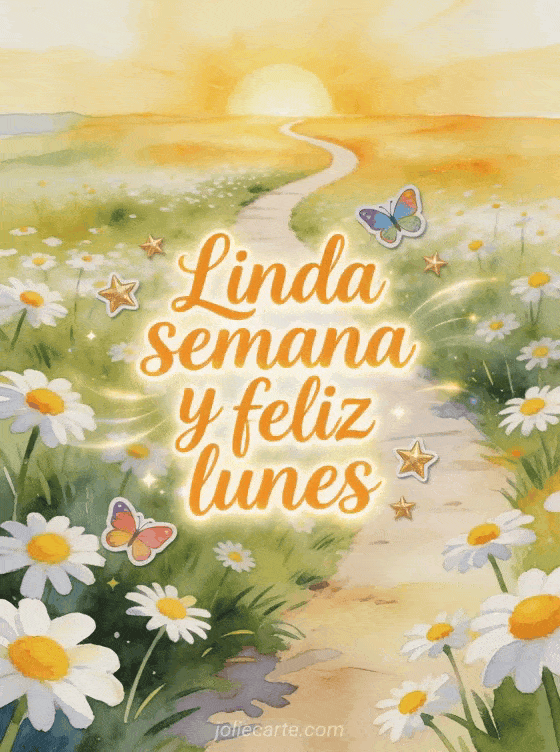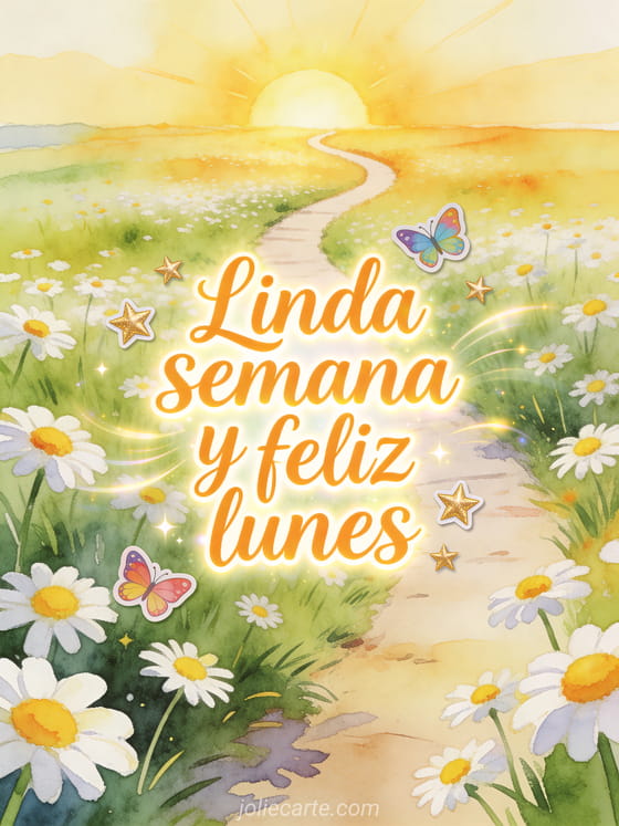 Envíen linda semana y feliz lunes con una pradera amplia de margaritas, un camino curvo hacia un amanecer dorado, mariposas coloridas y estrellas. Descubran también buenos días feliz lunes y buena semana besos, buenos días lunes imagen o buena semana y feliz lunes imagen.