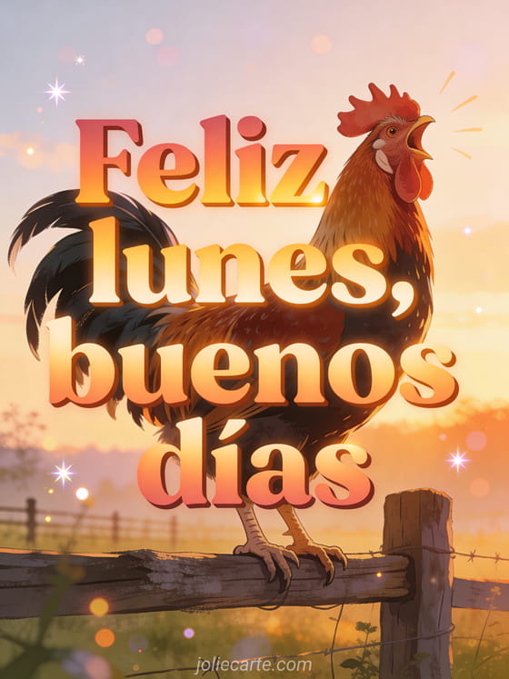 Envíen un saludo luminoso de feliz lunes y buenos días con letras de amanecer y un gallo cantando sobre una cerca rústica de granja. Descubran también buenos días y feliz lunes gif, tarjetas gratis de feliz lunes o feliz lunes y buena semana imagen.