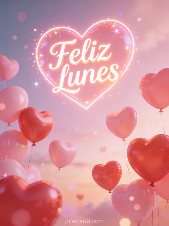 Comparte un emotivo saludo de lunes con globos de corazón rosa y rojo flotando en el cielo. Descubre también una buenos días lunes buena semana o una feliz lunes imágenes gratis.