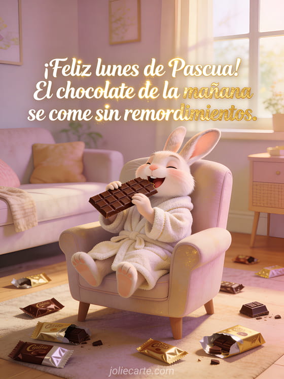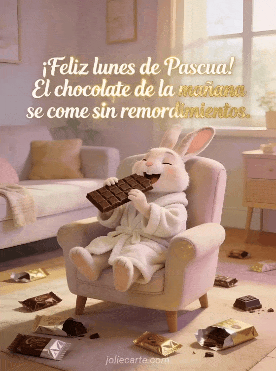 Envía un divertido saludo de lunes de Pascua con un conejo acogedor disfrutando una tableta de chocolate gigante sin ningún remordimiento. Descubre también un GIF de Pascua con humor o una tarjeta de Pascua humorística y una imagen graciosa de Pascua.