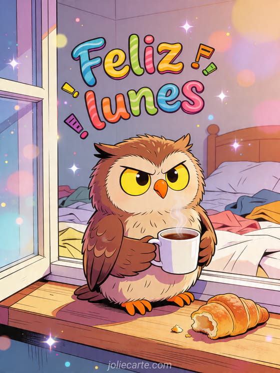 Envía una tarjeta de Feliz lunes con un búho malhumorado y una taza de café para arrancar la mañana con una sonrisa. Descubre también feliz lunes y buena semana, ánimo feliz lunes y bonita imagen feliz lunes.