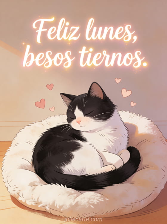 Envíen besos tiernos de feliz lunes con un gato blanco y negro acurrucado sobre un cojín y pequeños corazones. Descubran también feliz lunes lluvioso imágenes, feliz lunes gifs o un feliz lunes besos gif animado.