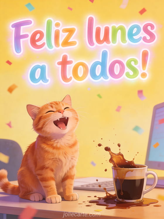 Empiecen la semana con una sonrisa gracias a este feliz lunes con un gato naranja hilarante y una taza de café derramada. Descubran también una feliz lunes gato besos imagen, unas feliz lunes lluvioso imágenes o unos feliz lunes gifs.