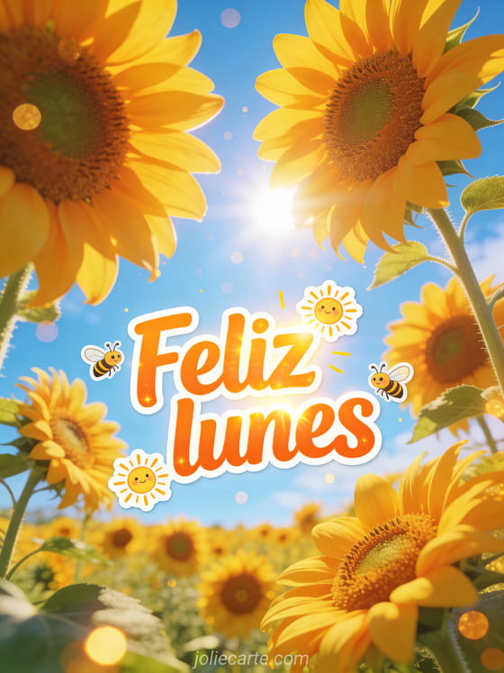 Envía un feliz lunes humor gif animado con letras naranja vivo, pequeños soles radiantes, abejas alegres y un campo de girasoles gigantes bajo un cielo azul claro. Comparte un deseo alegre para empezar la semana y descubre también feliz lunes imagen brillante, feliz lunes buena semana gif animado o feliz lunes besos gifs.