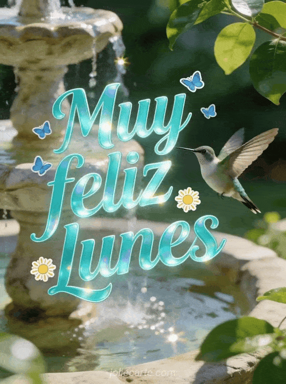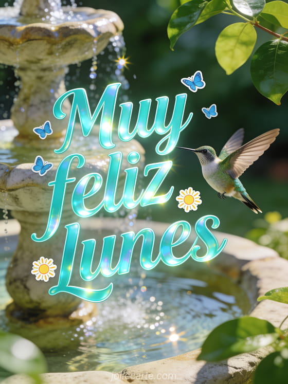 Envíen muy feliz lunes con un colibrí fotorrealista moviéndose junto a una fuente de piedra brillante y hojas verdes relucientes. Descubran también feliz lunes buena semana imagen gratis, buenos días feliz lunes y buena semana besos o buenos días lunes imagen.