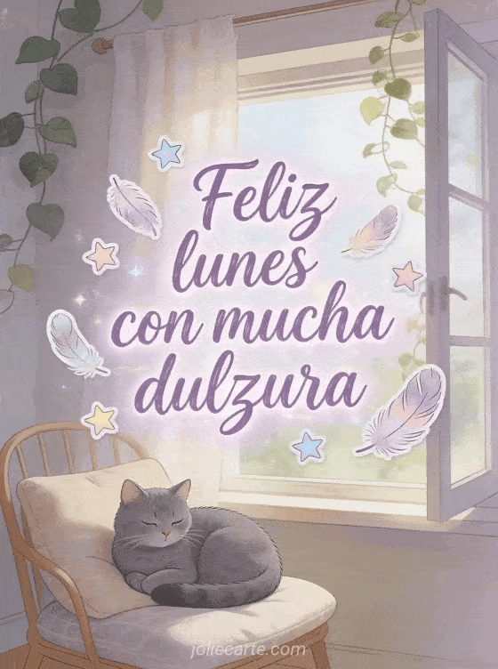 Envíen feliz lunes con mucha dulzura con un gato azul ruso acurrucado en un sillón acolchado cerca de una ventana abierta, cortinas luminosas y enredaderas verdes. Descubran también feliz lunes buena semana gif animado, feliz lunes besos gifs o feliz lunes buena semana gifs.