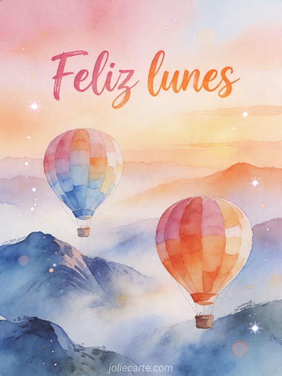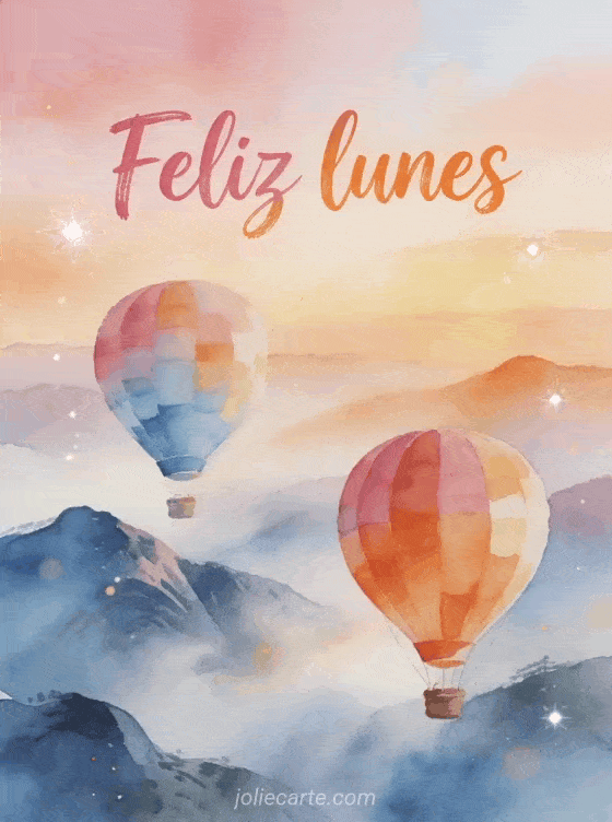 Envía una tarjeta de Feliz lunes con globos aerostáticos de colores sobre montañas brumosas para iniciar la semana con inspiración. Descubre también feliz lunes divertido, feliz lunes y buena semana y ánimo feliz lunes.
