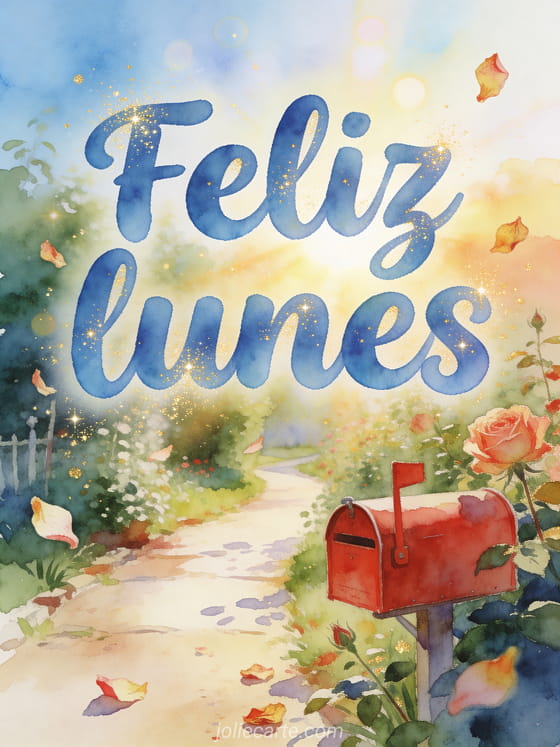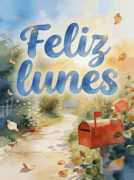 Comparte feliz lunes con un camino de jardín al amanecer en acuarela, un buzón rojo, pétalos flotantes de rosas antiguas y un suave brillo dorado. También pueden enviar feliz lunes imágenes bonitas, una feliz lunes cálido imagen o un feliz lunes y buena semana gif animado gif.