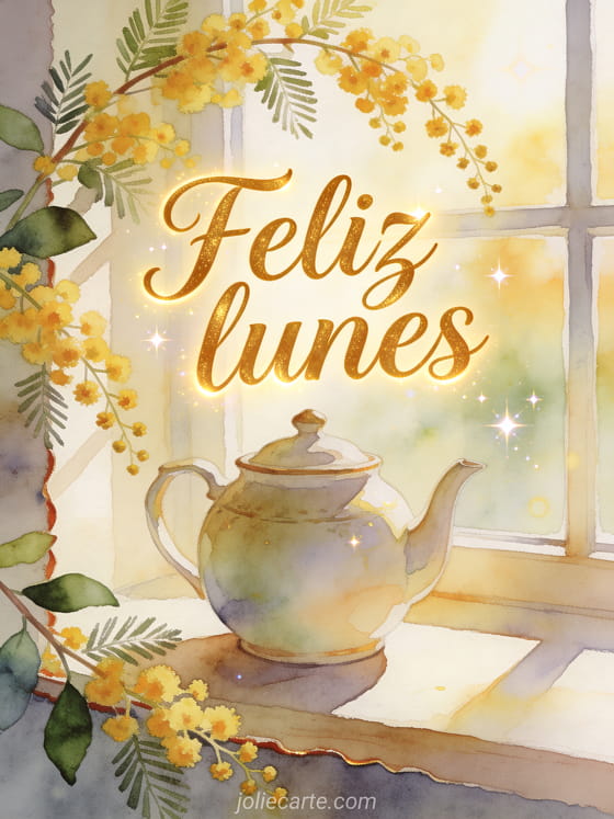 Envía un saludo cálido de feliz lunes con una tetera de porcelana junto a una ventana soleada y ramas frescas de mimosa en la luz acogedora de la mañana. Descubre también una buenos días feliz lunes imagen, un buenos días feliz lunes gif animado o un gif feliz lunes mujer.