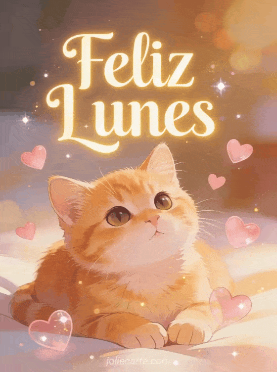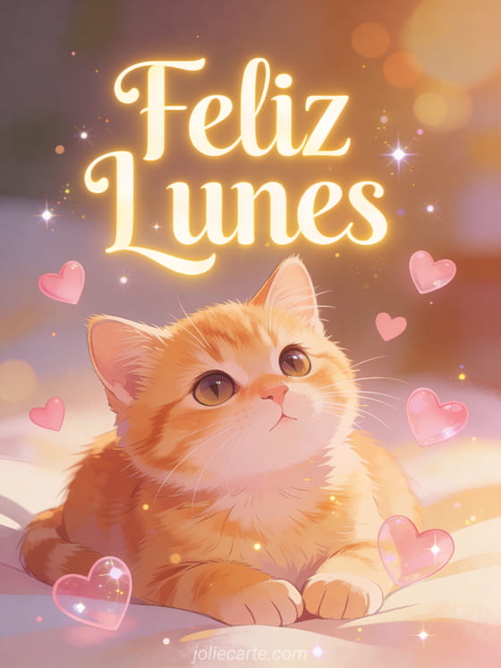 Empieza la semana con amor enviando esta adorable tarjeta de feliz lunes. Un tierno gatito naranja con ojos amorosos está rodeado de corazones rosa flotantes en una acogedora atmósfera matutina. Descubre también una tarjeta positiva de feliz lunes buena semana o una tarjeta divertida de motivación del lunes.
