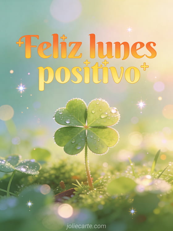 Comparte una alegre tarjeta de feliz lunes positivo con un campo de tréboles de cuatro hojas y rocío matutino. Empieza la semana con suerte y positividad. Descubre también una tarjeta que tengas un buen día lunes o una tarjeta feliz lunes gato.