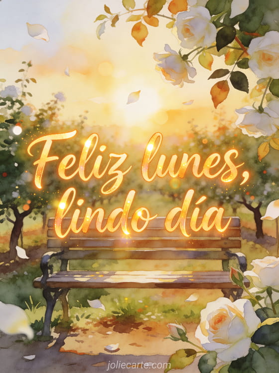 Envía un saludo optimista de lunes con letras ámbar en acuarela, un banco en un huerto radiante, cielo luminoso y pétalos de rosa blanca que salen del borde. También pueden compartir feliz lunes gifs, feliz lunes besos imágenes bonitas o una feliz lunes cita imagen.