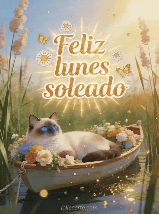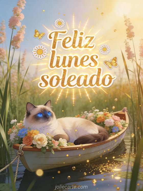 Envíen una tarjeta de feliz lunes soleado con letras doradas radiantes, pequeños soles, mariposas doradas y una barca florida amarrada entre juncos, donde un gato sagrado de Birmania de ojos azules descansa entre ramos de flores. Descubran también gif brillante de feliz lunes brillante, feliz lunes soleado gif o lunes besos imágenes.