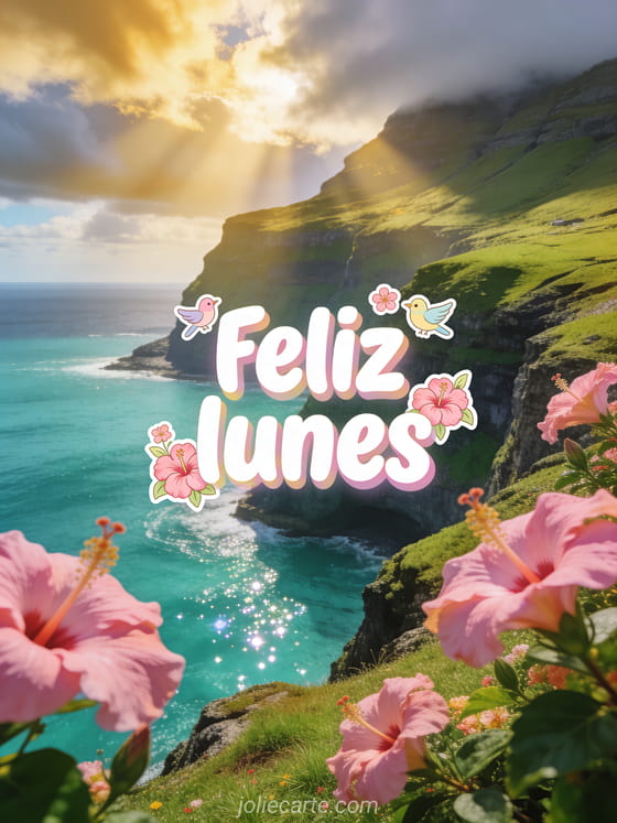 Envíen una tarjeta luminosa de feliz lunes con letras blancas redondeadas, stickers de hibiscos rosados y aves alegres, en los acantilados verdes de las Islas Feroe sobre el océano turquesa con rayos dorados y bruma marina brillante. Descubran también feliz lunes tarjetas virtuales, feliz lunes humor gif animado o feliz lunes imagen brillante.