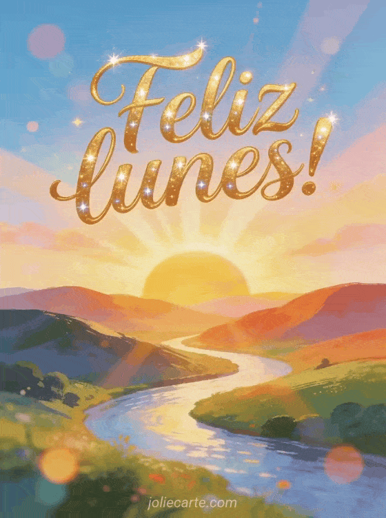 Comparte tarjetas de feliz lunes con caligrafía dorada, un amanecer sobre colinas suaves, un río serpenteante y rayos de luz. También pueden enviar una feliz lunes tarjeta virtual gratis, gif feliz lunes buena semana o una feliz lunes imagen animada.