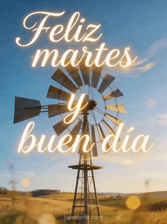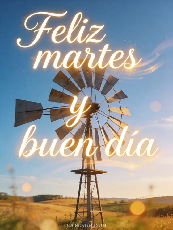 Comparte un saludo de feliz martes y buen día con letra dorada elegante, un molino en un campo luminoso, cielo azul claro y luz cálida cinematográfica. Descubre también texto para desear un feliz martes, feliz martes perro gif o gif de feliz martes.