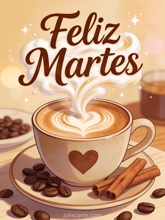 Alegra el martes de alguien con esta cálida tarjeta de café con hermoso latte art en forma de corazón en una taza de cerámica. Descubre también gif feliz martes besos gratis o imágenes feliz martes buena jornada.