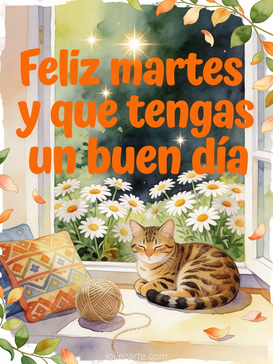 Comparte un mensaje acogedor de feliz martes con un gato bengal junto a una ventana con margaritas, un ovillo de lana y cojines estampados. También puedes enviar feliz martes tarjetas, una feliz martes imagen brillante o un buen día feliz martes gif.