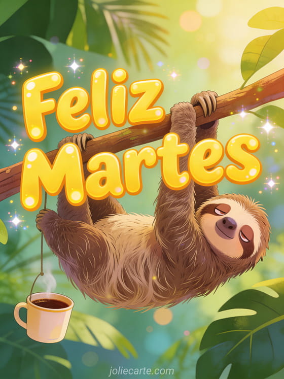 Haz reír a alguien este martes con esta cómica tarjeta con un gracioso perezoso colgado boca abajo con expresión soñolienta y una taza de café colgando. Descubre tambi��n una tarjeta feliz martes imagen, una tarjeta gif feliz martes besos o una tarjeta feliz martes con animales.