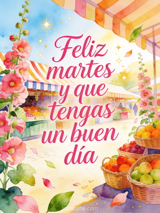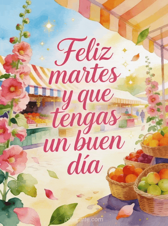 Desea un feliz martes y un buen día con un puesto de mercado lleno de vida, flores de malvarrosa y cestas de frutas brillantes. Descubre también feliz martes mis amigos imágenes, una feliz martes imagen gratis o un feliz martes gif animado divertido.